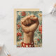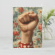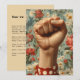 A realistic painting of a clenched fist raised in front of a vibrant floral background. The contrast between strength and beauty creates a striking visual impact.