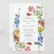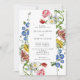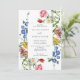 A bold wedding invitation featuring a rectangular frame overlaying large watercolor flowers in blue, yellow, white, red and pink.