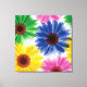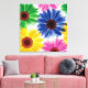Wrapped canvas art is shown with a graphic print of pretty bold daisy flowers.