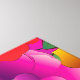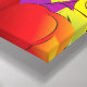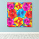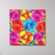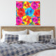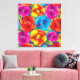 Wrapped canvas art is shown with a graphic print of pretty bold coloured flowers.
