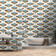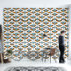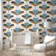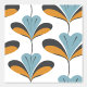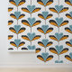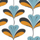 Retro-inspired wallpaper featuring bold geometric floral shapes in blue, orange, and cream against a black background. Perfect for mid-century modern interiors, accent walls, or statement fabric projects with a vintage 70s vibe.