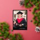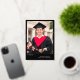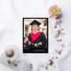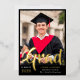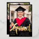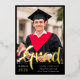A graduation announcement and graduation party invitation in one! Show off your graduate's achievement with this bold typography graduation announcement with their photo in the spotlight, with Grad written in a bold gold foil script in a modern style across the bottom of the photo. Personalize the custom text with the year, your graduate's name, the school they graduated from, and the degree they've gotten. Add the graduation celebration invite on the back of the card, beneath a second photo of the graduate. He did it! is written across the second photo, but as the text is editable, you can change it to She did it or They did it, depending on the pronoun of the graduate. The text is a stark white against a black background.
