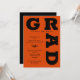 GRAD in bold black lettering curves around the edges of these orange background graduation party invitations. SEE ENTIRE COLLECTION of pre-done colour combinations, paper plates, napkins, favour boxes and graduation party invitations in our store.