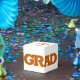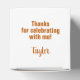 GRAD in bold burnt orange lettering wraps around the front of these white 2" square graduation party favour boxes with your name and thank you message on the top.