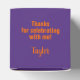 GRAD in bold orange lettering wraps around the front of these purple 2" square graduation party favour boxes with your name and thank you message on the top.