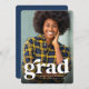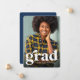 With a bold retro grad in white, this vertical one-photo card is the perfect way to announce your graduate to family and friends. The vintage styling is subtle and simple for this graduation announcement and perfectly on trend for this graduating class. The back of this card is navy blue with a speckled texture. The blue colour can be changed by clicking "customise further."