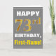 This simple birthday-themed greeting card design features a warm birthday wish like "HAPPY 73rd BIRTHDAY, First-Name!" on the front, in bold text on a grey (grey) coloured background. The birthday number has a faux/imitation gold-like colouring appearance. The name on the front can be customised. The inside features a birthday message that can be customised. A greeting card like this could be a fun way to deliver birthday wishes to somebody who is celebrating their seventy third birthday. [~Z0000283]