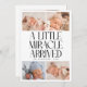 Modern Christmas theme birth announcement card featuring a bold typography text that says "a little miracle arrived" with 4 of your newborn pictures. This is a birth announcement card for the holiday seasons! Add your pictures, birth stats, and a message! The background is white.