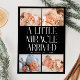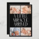 Modern Christmas theme birth announcement card featuring a bold typography text that says "a little miracle arrived" with 4 of your newborn pictures. This is a birth announcement card for the holiday seasons! Add your pictures, birth stats, and a message! The background is black.