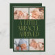 Modern Christmas theme birth announcement card featuring a bold typography text that says "a little miracle arrived" with 4 of your newborn pictures. This is a birth announcement card for the holiday seasons! Add your pictures, birth stats, and a message! The background is green.