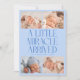 Modern Christmas theme birth announcement card featuring a bold typography text that says "a little miracle arrived" with 4 of your newborn pictures. This is a birth announcement card for the holiday seasons! Add your pictures, birth stats, and a message! The background is icy blue.