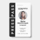 Bold and modern black press pass photo identification badge. The design features "Press Pass" displayed along the side for easy view and identification. The photo is displayed in a circle frame to create a modern look. Customize with logo, photo, job title, joined/valid date and ID number. The reverse side features black and white design with a logo and address. The color can be changed to any color to suit your brand, simply click personalize and click to customize further.