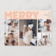 Send warm wishes this holiday season with this unique and cute, bold modern coral merry year in review five photo holiday postcard. Its simple and minimalist design features boho-inspired elements in light pink, pastel coral, sage green, blush, and peach hues. Celebrating the festive spirit of December, this design brings a cheerful and fun touch to any occasion. The bright pale seasonal colours and creative wording make it a perfect way to spread happiness and cheer among friends and family this winter!