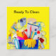 Bold modern two side house cleaning services business card design template created with a variety of house cleaning supplies on the front and your business name or Professional name featured. Printed on cool square format business card style.