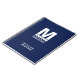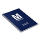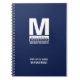 Custom notebook with employee name and department features a simple yet professional, modern and bold business monogrammed logo with colour block business name and tagline. Customisable typography stretches to align on both sides to create a block on top of another block aesthetic. Professional and elegant navy blue background.