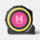 This fun, stylish tape measure features a magenta pink background that goes well with the yellow ring and yellow coloured back. Text templates are included for both a monogram initial and name, both in modern styled fonts. Makes a great stocking stuffer or gift for any other occasion! Text and background colour can both be customised, if desired.