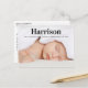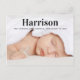 This modern birth announcement postcard features bold typography and a large photo. On the front of the postcard, your newborn's name is written in modern type across the top, with her or his full name and birth date added below. The text overlays your favourite photo. On the back, you can add a longer custom message to recipients, and include your baby's birth stats.