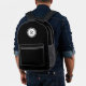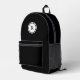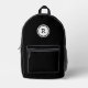 Sleek black backpack features a bold black monogram in a white circle with a narrow black border and a thin outer white ring. Add your initial in the sidebar.