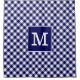 Custom navy blue and white gingham shower curtain features a large, bold white monogram on a dark blue square in the centre. Add your initial in the sidebar. Navy, white, and light blue diamonds form the buffalo plaid background.
