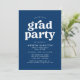 Stylish graduation party invites featuring "grad party" displayed in bold white lettering with the graduate's name and party details shown below on a navy blue background. The back of the navy graduation party invite features the graduate's vertical photo. The simple graduation party invites are perfect for both high school and college graduates.
