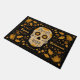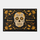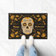A cheerful Halloween greeting in bold orange with smiling skulls and vibrant autumn leaves. Eye-catching and festive.