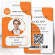 Photo ID badge featuring your custom photo and logo on a colourful orange white retro design. The lower text area on the front shows a rectangular shape, which you can scale in the advanced editor. On the back you can add a custom bar code or QR code and additional texts (or delete the templates). Great to create an eye-catching presence.