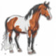 Muscular paint horse with brown and white patches, standing on green grass. Dramatic shading and a black backdrop create bold, dramatic stock imagery suitable for equine themes.