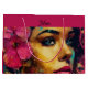 Bold and vibrant, this artistic portrait showcases a woman's captivating gaze with striking blue eyes and vibrant pink hibiscus floral accents. The splashes of colour in the background bring an abstract, modern twist. This image exudes emotion and creativity, perfect for those who appreciate expressive and colourful artwork. This customisable gift bag is perfect for Birthday's, house warming gifting, or a Graduation gifting.
