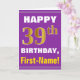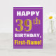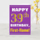 This simple birthday-themed greeting card design features a warm birthday wish like "HAPPY 39th BIRTHDAY, First-Name!" on the front, in bold text on a purple coloured background. The birthday number has a faux/imitation gold-like colouring appearance. The name on the front can be customised. The inside features a birthday message that can be customised. A greeting card like this could be a fun way to deliver birthday wishes to somebody who is celebrating their thirty ninth birthday. [~Z0000277]