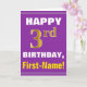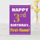 This simple birthday-themed greeting card design features a warm birthday wish like "HAPPY 3rd BIRTHDAY, First-Name!" on the front, in bold text on a purple coloured background. The birthday number has a faux/imitation gold-like colouring look. The name on the front can be customised. The inside features a customisable birthday message. A greeting card like this could be a fun way to deliver birthday wishes to somebody who is celebrating their third birthday. [~Z0000277]