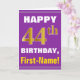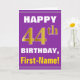 This simple birthday-themed greeting card design features a warm birthday wish like "HAPPY 44th BIRTHDAY, First-Name!" on the front, in bold text on a purple coloured background. The birthday number has a faux/imitation gold-like colouring appearance. The name on the front can be customised. The inside features a birthday message that can be customised. A greeting card like this could be a fun way to deliver birthday wishes to somebody who is celebrating their forty fourth birthday. [~Z0000277]