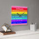 Fun, rainbow stripes wall clock with friendly hints on how to help keep the community bathroom clean. Customers can change the text.