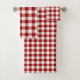 Add a striking accent to your bathroom with a stylish custom towel set including a wash cloth, hand towel, and bath towel featuring a bold red and white gingham plaid pattern. Dark red, white, and light red squares form a bold buffalo plaid. Buy the full set or any piece of it.