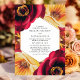 This bold and elegant wedding invitation features vibrant red and yellow flowers framing a modern gold geometric hexagon. The clean off-white background within the frame highlights the striking floral design, making it perfect for couples looking to blend classic elegance with a modern twist. This invitation sets a sophisticated tone for a wedding full of style and personality.