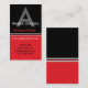 All text can be customised, including monogram letter. Bold, stylish black and red with stripes vertical business card.