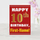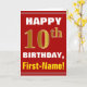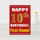 This simple birthday-themed greeting card design features a warm birthday wish like "HAPPY 10th BIRTHDAY, First-Name!" on the front, in bold text on a red coloured background. The birthday number has a faux/imitation gold-like colouring look. The name on the front can be customised. The inside features a customisable birthday message. A greeting card like this could be a fun way to deliver birthday wishes to somebody who is celebrating their tenth birthday. [~Z0000276]
