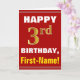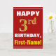 This simple birthday-themed greeting card design features a warm birthday wish like "HAPPY 3rd BIRTHDAY, First-Name!" on the front, in bold text on a red coloured background. The birthday number has a faux/imitation gold-like colouring look. The name on the front can be customised. The inside features a customisable birthday message. A greeting card like this could be a fun way to deliver birthday wishes to somebody who is celebrating their third birthday. [~Z0000276]