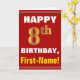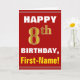 This simple birthday-themed greeting card design features a warm birthday wish like "HAPPY 8th BIRTHDAY, First-Name!" on the front, in bold text on a red coloured background. The birthday number has a faux/imitation gold-like colouring look. The name on the front can be customised. The inside features a customisable birthday message. A greeting card like this could be a fun way to deliver birthday wishes to somebody who is celebrating their eighth birthday. [~Z0000276]