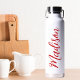 A bold red personalised monogram water bottle for a girl or guy who loves simple, handwritten gifts. Beautiful cursive script down the side of your bottle spelling out your name.