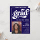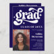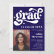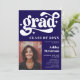 Celebrate the graduate in style with this retro-inspired graduation party invitation! Featuring a fun and bold navy blue "Grad" typography with playful swashes and sparkles, this design brings a vintage yet modern touch. The blue background complements the stylishly framed graduate photo, creating a standout keepsake. Perfect for high school or college graduation announcements and celebrations!