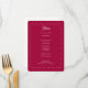 This retro inspired and bold menu card in rounded shape features a wave frame, script font and your dinner menu or wedding menu on bold pink fuchsia background. Perfect for a modern wedding or any other elegant event. On the back is room for your names and wedding date - or simply delete the text on the back. All colours of this wedding menu card - background, text and wave frame colour - can be changed in the design tool. This magenta wedding menu card is part of a wedding collection with more matching items.