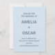 This wedding invitation features large bold names centered on a soft blue background, with the date, venue, and RSVP details below in clean lettering. Everything is typography - the names are big, bold, and the focal point of the whole card. A great fit for a couple who wants something calm, clean, and current.