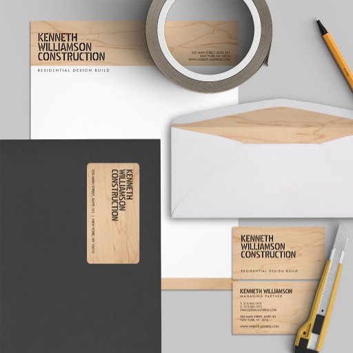 Your name or business name is shown in a bold, stencil-style font on a maple plywood background image on this construction or builder's business card template. The aesthetic is carried over onto the back of the card. © 1201AM CREATIVE