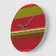This simple yet decorative wall clock features a colourful retro abstract pattern of bold geometric stripes in colours of red, orange, brown, olive green, black and tan.