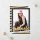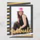 Gold foil look typography reads "graduate" over the vertical centred photo. Grey background can be customised if desired. Stripes at the bottom in white and gold with customised text. Please replace the template image prior to purchasing. Modern, stylish, fun - perfect! Product does not contain actual gold foil.