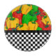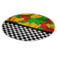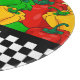 Top half of this round cutting board design is bright and bold coloured bell peppers in green, red and yellow with bottom half a black and white chequerboard.