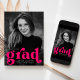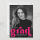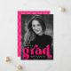 Stylish graduation announcements featuring the graduate's vertical photo with "grad" in bold hot pink lettering. Personalise the photo graduation announcement by adding the graduate's name, graduation year, and school. The announcement reverses to display a hot pink and white retro arch pattern.