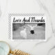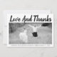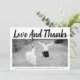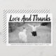 Bold typography Wedding Thank You photo with the text "Love and Thanks". The backside includes a diagonal striped pattern with black and white stripes and your photo.