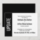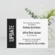 Here's a bold, modern card for notifying your guests if it's become necessary to change your wedding date. Use the template fields to add your personal details and make this unique, simple design your own. A colour block along the left is black, matching the text and back of the card; "UPDATE" appears in bold white over this strip on the left. All fonts and colours are also editable. Please reach out with any special requests or for customising assistance. Other pieces with alternate wording are also available in the collection.