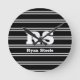 Bold White Monogram & Name, Lt Grey Lines on Black Round Clock